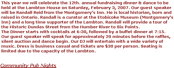 On the first Friday of every month, except February (due to our annual Dinner/Dance) and the summer months of July and August. The Howland and Humber rooms are converted into an informal setting for our very popular community pub nights. Resfreshments, both alcoholic and non-alcoholic, are available at very reasonable prices. Complimentary snackies are provided. In addition, hot roast beef sandwiches, in the tradition of the Lambton House, are available for purchase - arrive early as they sell out quickly!! All this is accompanied with live music provided by local musicians. Doors open at 6:00 p.m. with music from 8:00 to 11:00. |